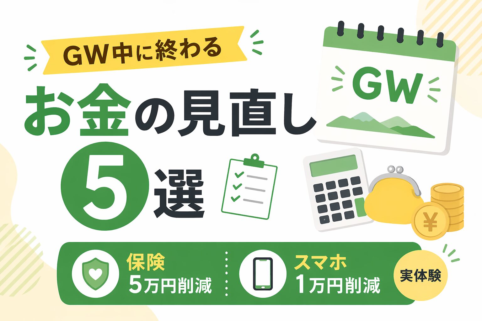 私自身、保険の見直しで月5万円の削減、スマホ代で夫婦合計月1万円の節約を実現しました。この記事ではGW中に実践できるお金の見直し5選を、実体験をまじえてご紹介します。